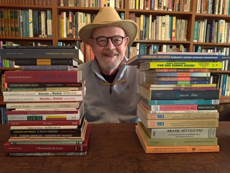 Augusto de Franco é escritor, palestrante e consultor. Foi o criador e um dos netweavers da Escola-de-Redes – uma rede de mais de 13 mil pessoas dedicadas à investigação sobre redes sociais e à criação e transferência de tecnologias de netweaving. Tem 30 anos de experiência de aplicação de tecnologias interativas de netweaving para induzir o desenvolvimento endógeno em empresas, organizações e localidades. É autor de mais de duas dezenas de livros sobre desenvolvimento local, capital social, democracia e redes sociais.