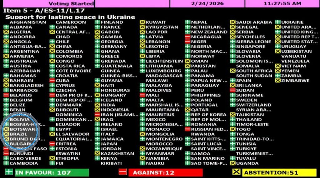 A abstenção nesse caso só torna mais covarde a postura brasileira. Como sempre equiparou agressor e agredido, estabeleceu uma falsa equivalência que ignora a realidade desta guerra: a de que há um país invadindo outro, confiscando territórios e vitimando civis. Ou seja, a neutralidade aqui é uma posição favorável ao agressor. Ponto.