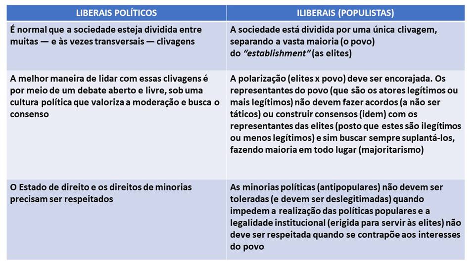 O quadro abaixo resume as características do populismo contemporâneo em contraposição ao liberalismo político: