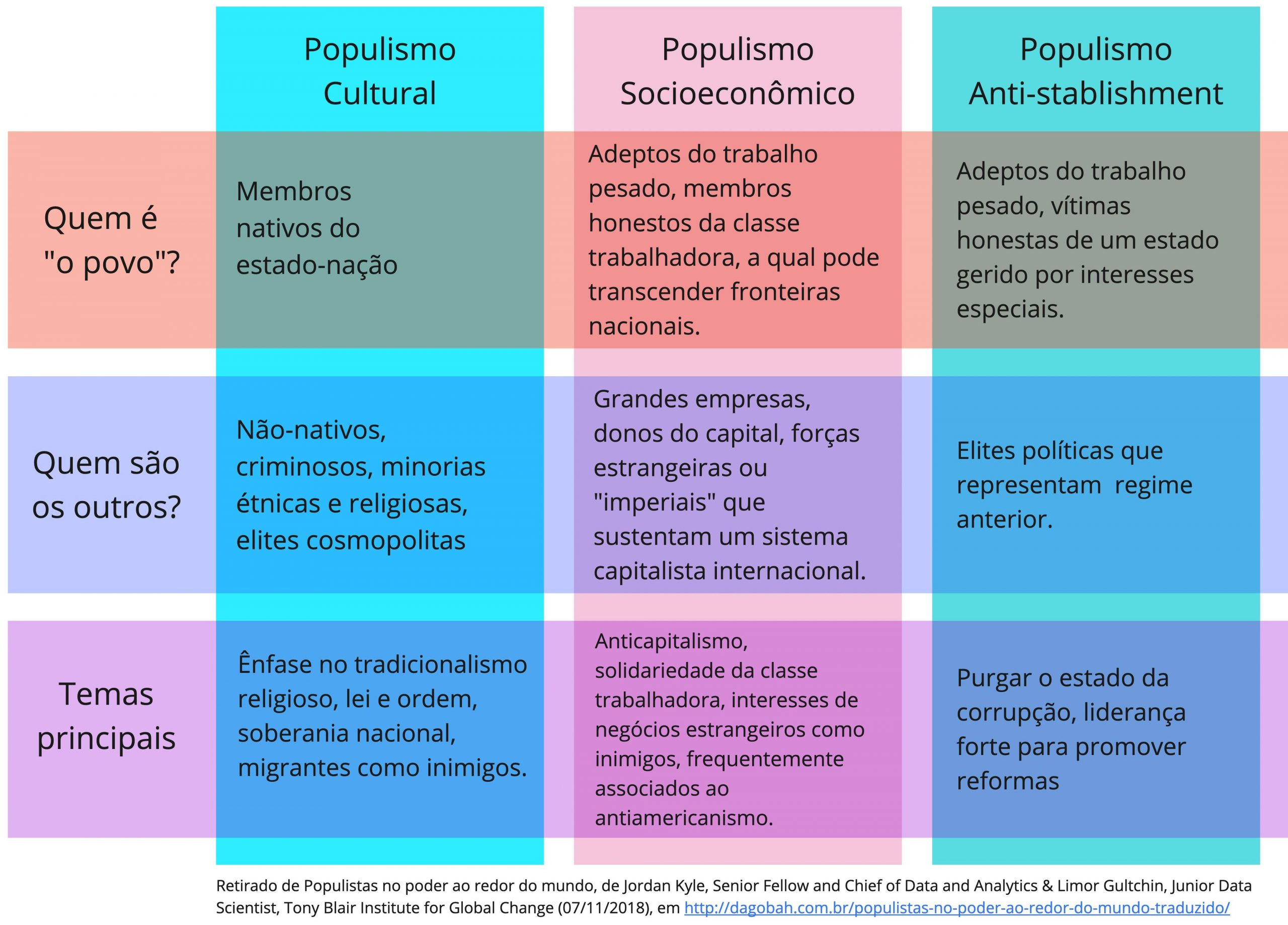 Há até quem faça uma distinção entre populismo cultural, populismo socioeconômico e populismo anti-establishment. O quadro abaixo mostra as três maneiras pelas quais os populistas enquadram o conflito “nós x eles” (apud Populistas no poder ao redor do mundo by Jordan Kyle & Limor Gultchin, Tony Blair Institute for Global Change, 07/11/2018):