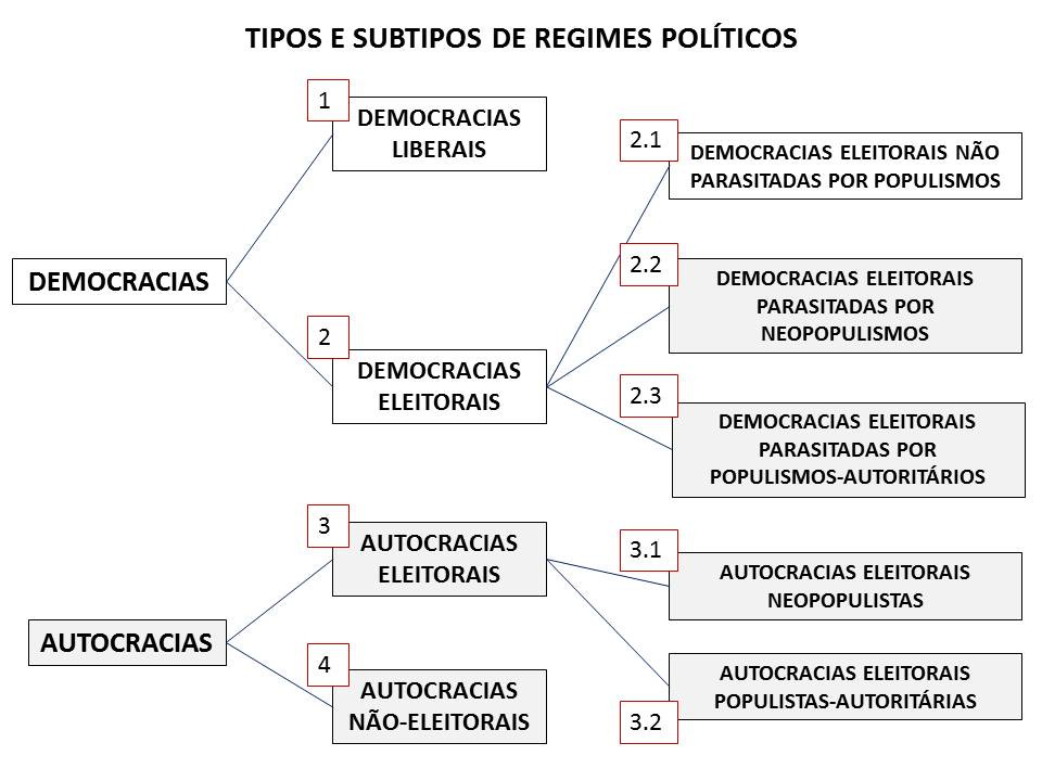 Usando a classificação de regimes políticos do V-Dem (Universidade de Gotemburgo) pode-se resumir essa "parasitologia política" que caracteriza o populismo contemporâneo no seguinte quadro: