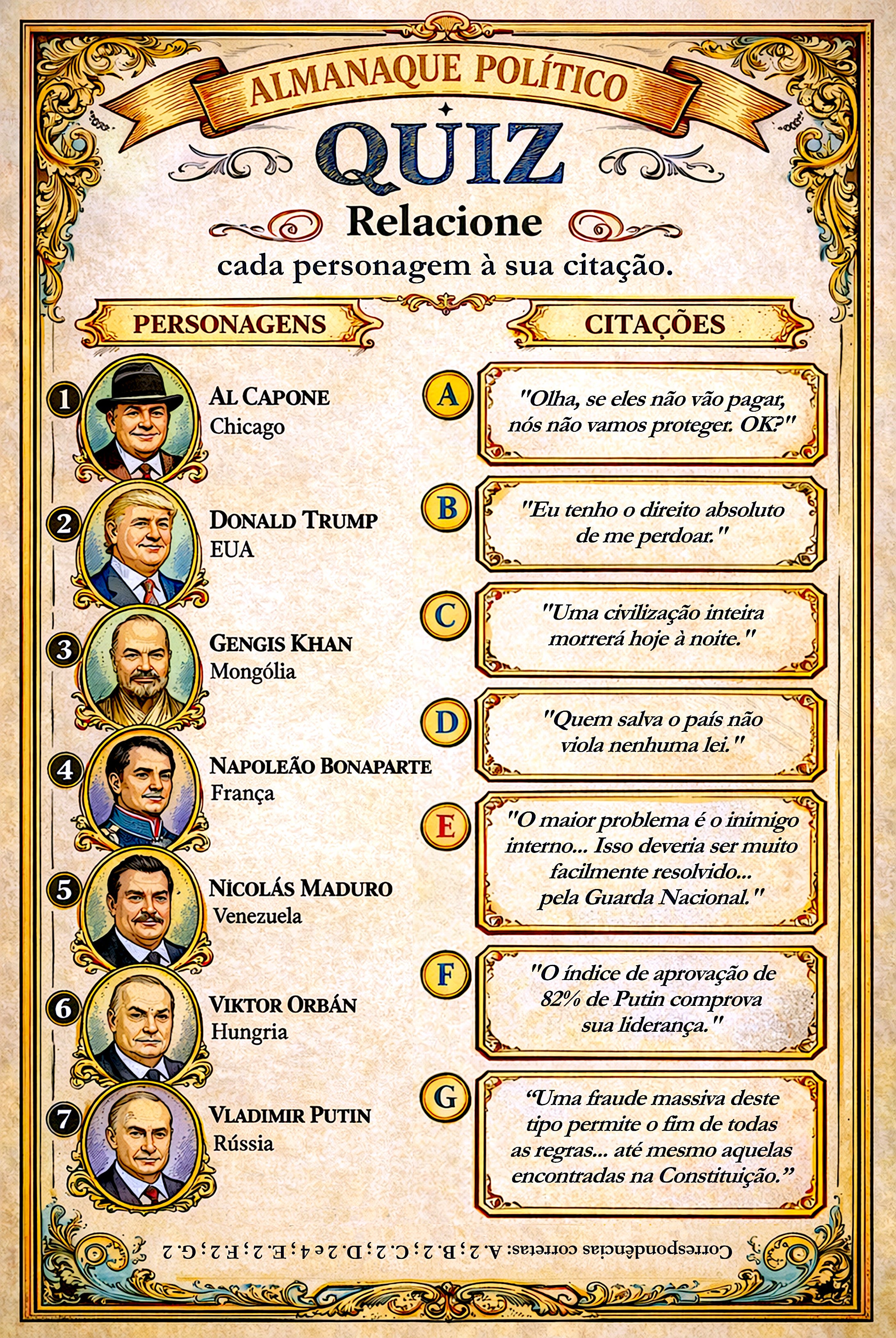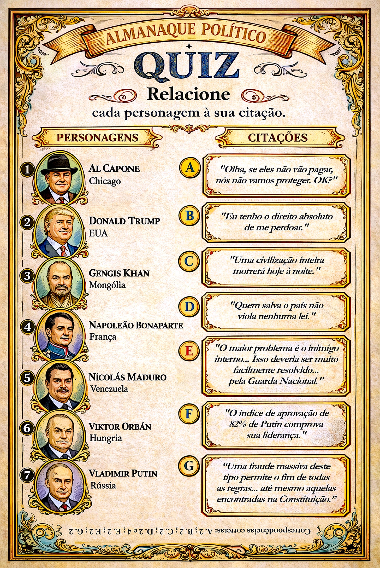 Referências: A. Comício, 14Fev2024; B. Twitter, 04Jun2018; C. Truth Social, 07Abr2026; D. Truth Social, 14Fev2025 e Discurso, 09Nov1799; E. Fox News, 13Out2024; F. NBC News, 07Set2016; G. Truth Social, 03Dez2022.
