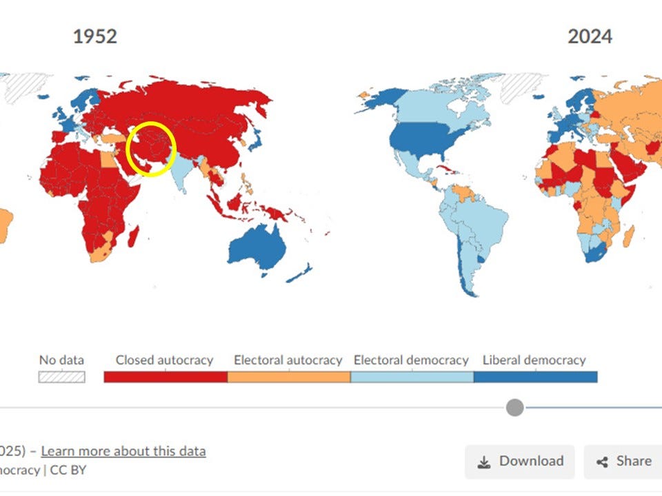 O governo de Mohammad Mossadegh ocorreu entre 1951 e 1953. Abaixo o mapa Regimes of the World (V-Dem) do ano de 1952 mostrando que nesse ano, em pleno governo Mossadegh, o Irã era uma autocracia fechada e não uma democracia, nem liberal, nem apenas eleitoral: